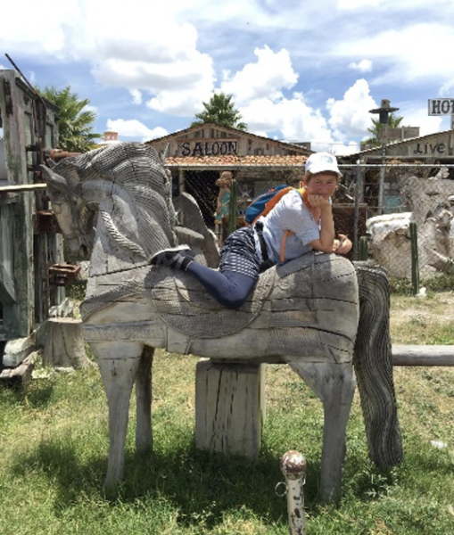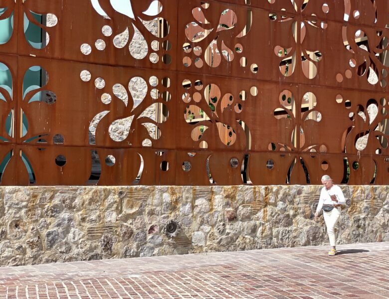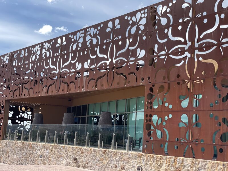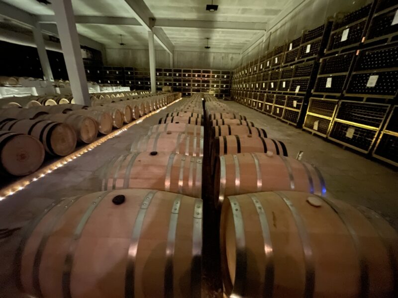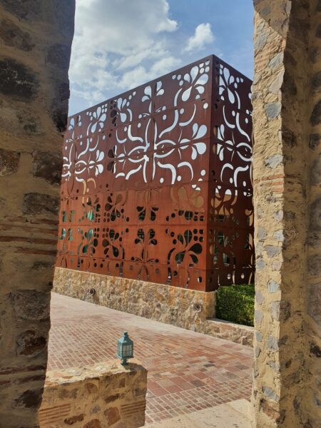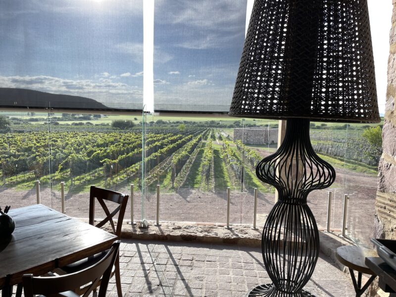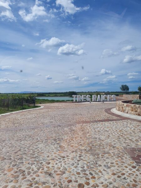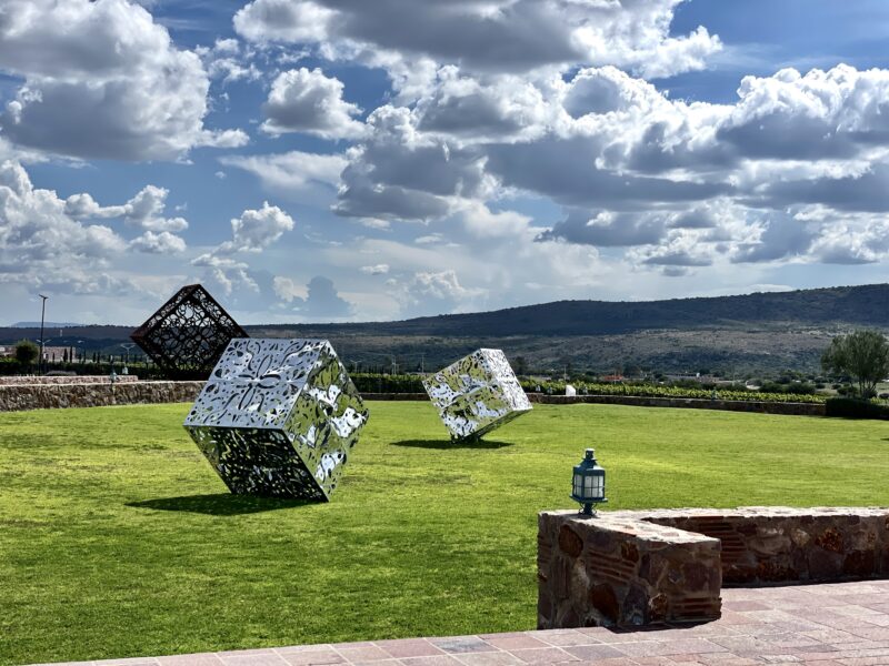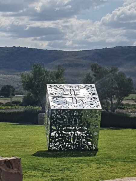 Wir bogen irgendwo von der Hauptverkehrsstraße nach links ab. Roger fuhr eine ganze Weile auf dem Staubstreifen neben der Fahrbahn in die entgegengesetzte Richtung. Uns war ganz mulmig. Dann bog er in eine Staubstrasse ein, zwischen Hütten fuhr er hindurch. Wir hielten uns Tücher vors Gesicht um nicht zu niesen, so kitzelte uns der Staub in der Nase. Wir fanden und in einer Landschaft wieder, voller Kakteen, Steinen und, wie gesagt, Staub! Auf einem unbefestigten Weg ratterten und holperten wir ins No-Where. Doch nach einer Brücke zeigte sich uns plötzlich eine völlig neue Landschaft und Straße: märchenhaft, modern und gepflegt mit futuristischen Laternen. Schlanke und elegante Zypressen säumten den Straßenrand und an einem bewachten riesigen Tor, fuhren wir schließlich auf ein modernes Weingut „Tres Raices.“ Riesige spektakuläre Kunstobjekte waren in riesigen grünen und saftigen Weinanbauflächen arrangiert! Was für ein Gegensatz!