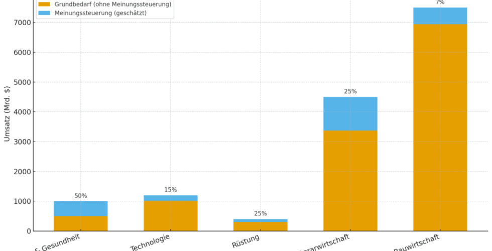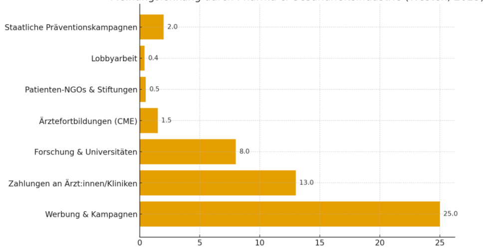 Branchen im Spiegel der Meinungssteuerung Wenn wir auf die großen Industriezweige blicken – Pharma, Agrar, Rüstung, Technologie und Bau – sehen wir enorme Unterschiede darin, wie stark sie von Meinungssteuerung abhängen. Gemeint sind damit Werbung, Lobbyarbeit, Forschungssponsoring, NGO-Finanzierungen und politische Kampagnen. Die Pharmaindustrie sticht dabei besonders hervor. Von rund