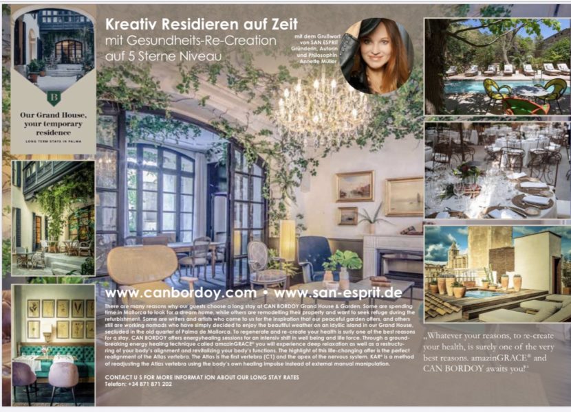 […] Die beiden sprechen auch über das spannende Mallorca Projekt der École San Esprit. In Palma de Mallorca gibt es eine Kooperation mit einem der beiden Fünfsterne Hotels CAN BORDOY. Dort kann sich jeder im Hotel einmieten und dann Heilsitzungen im Spa-Bereich erhalten. Nähere Infos gibt es hier. […]